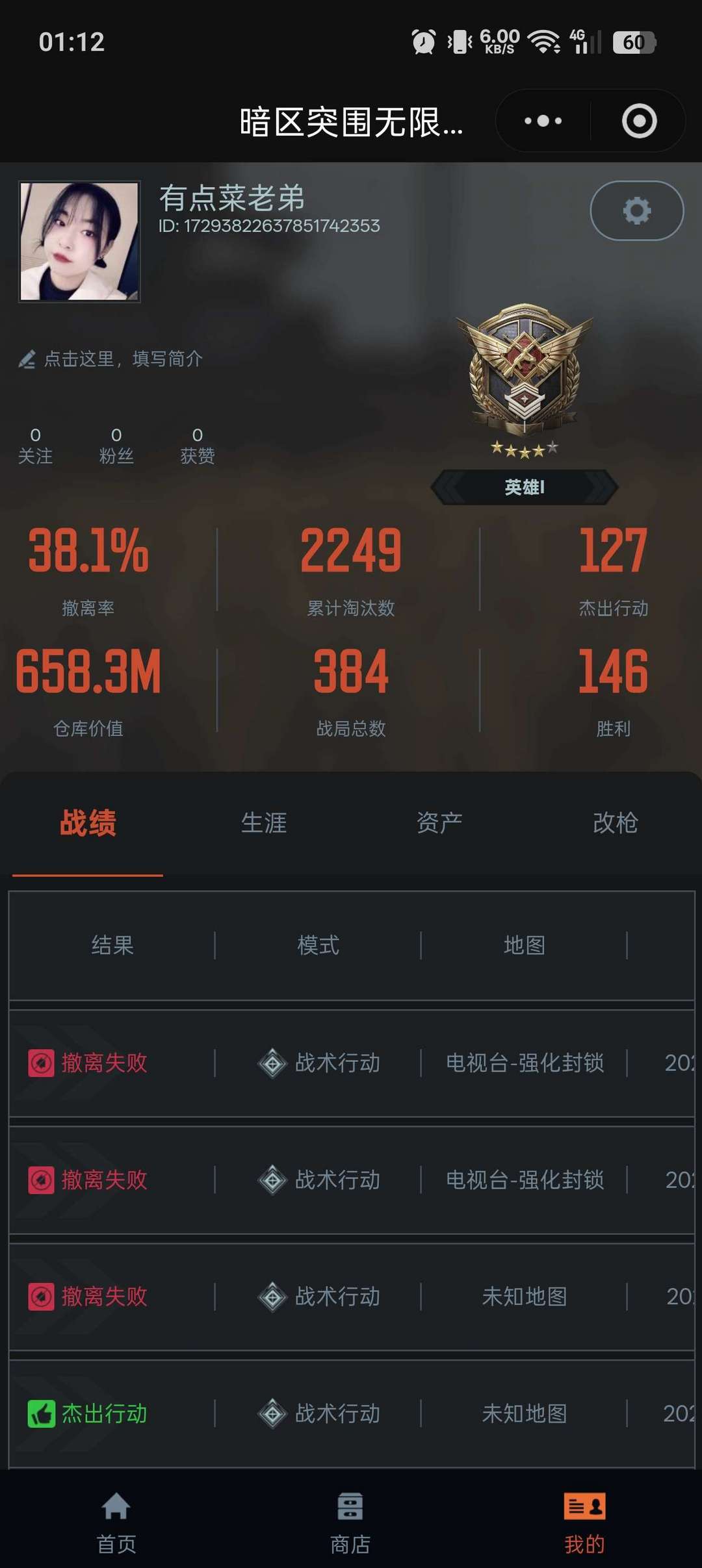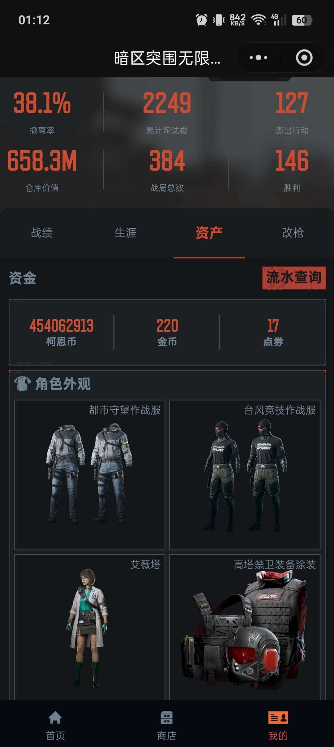 纯币4.5亿,仓库价值658M,9格保险,皮肤有蝴蝶刀、艾薇塔、纯净黎明H4、黄金AK12