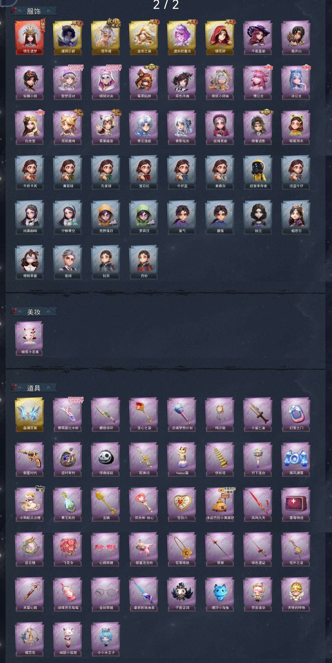 装备描述:【幻梦皮肤】巫铃儿-镜生遗梦 【金色皮肤】零-渡鸦公爵、逍遥-莲华渡、薇薇安-圣光之谕、小黄-遗失的童话、巫铃儿-镜花辞 【紫色皮肤】兰-千夜星谕、零-搬开山、薇薇安-仙锋小姐、爱丽丝-甜梦派对、艾伦-绒绒对决、莉莉-莓果陷阱、小黄-异色序曲、莉莉-除妖小师妹、莉莉-情公主、爱丽丝-冰公主、薇薇安-白光莹、阿念-灵昭鹿鸣、小黄-霓裳踏雪、零-青云逸歌、巫铃儿-素影瑶光、爱丽丝-丝缕哀歌、逍遥-绣春逍影、小黄-呱呱雨衣 【道具皮肤】喷气背包-晶澜灵翼、短管猎枪-赞萌露比水枪、刺刀-碧络琅环、铲子-圣心之泪、专业手电-云端梦想计划、音响-鸣沙鼓、刺刀-小鲨匕首、传送按钮-幻宠之门、转轮手枪-新星时代、传送按钮-逆时审判、腰包-惊魂娃娃、摸金符-祝祷词、音响-happy猫、葫芦-伏妖塔、腰包-月下莲台、喷气背包-乘风溯雪、长鞭-小狗蛇点点鞭、黄牛能量饮料-青玉抱丹、铲子-龙鳞、腰包-宝剑八、铲子-卡皮巴拉小黄豚铲、桃木剑-凤鸣九天、急救包-蔷薇物语、传送按钮-昆仑镜、额外的背包-飞花令、夜视仪-心跳眼镜、电击枪-甜蜜泡泡枪、摸金符-花落精绝、桃木剑-绯色遗证、除颤仪-弦外之音、急救包-末章心