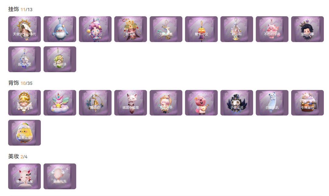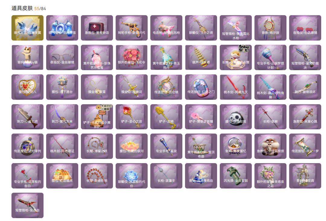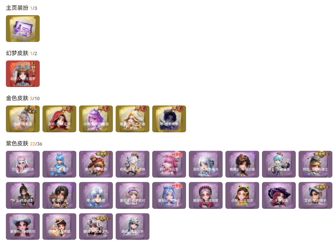 装备描述:红皮1;金皮5;紫皮22;道具皮56;皮肤:巫铃儿-镜生遗梦,小黄-遗失的童话,逍遥-莲华渡,零-渡鸦公爵,薇薇安-圣光之谕,巫铃儿-镜花辞,艾伦-水王子,阿念-王子与骑士,爱丽丝-丝缕哀歌,阿念-庆宴绮愿,艾伦-黎明猎手,莉莉-情公主,阿念-迷途僵宝,艾伦-绒绒对决,爱丽丝-冰公主,爱丽丝-耀眼的你,兰-千夜星谕,薇薇安-仙锋小姐,零-搬开山,小黄-呱呱雨衣,逍遥-万迭云华,莉莉-莓果陷阱,逍遥-绣春逍影,爱德华-梵卓之礼,零-青云逸歌,巫铃儿-素影瑶光,莉莉-除妖小师妹,爱丽丝-甜梦派对;道具:喷气背包-晶澜灵翼,铲子-圣心之泪,传送按钮-幻宠之门,腰包-宝剑八,急救包-末章心跳,短管猎枪-安魂曲,铲子-赞萌波板糖,长鞭-缚誓之锁,专业手电-星寂,黄牛能量饮料-青玉抱丹,腰包-私藏的银河,腰包-红运福虎,电击枪-甜蜜泡泡枪,音响-咏叹调,铲子-卡皮巴拉小黄豚铲,长鞭-新春炸响,葫芦-伏妖塔,黄牛能量饮料-珍珠芭乐莓莓,桃木剑-最后的独角兽,音响-冬夜暖忆,夜视仪-心跳眼镜,专业手电-云端梦想计划,传送按钮-昆仑镜,额外的背包-飞花令,长枪-罪棘,刺刀-紫气东来,短管猎枪-赞萌露比水