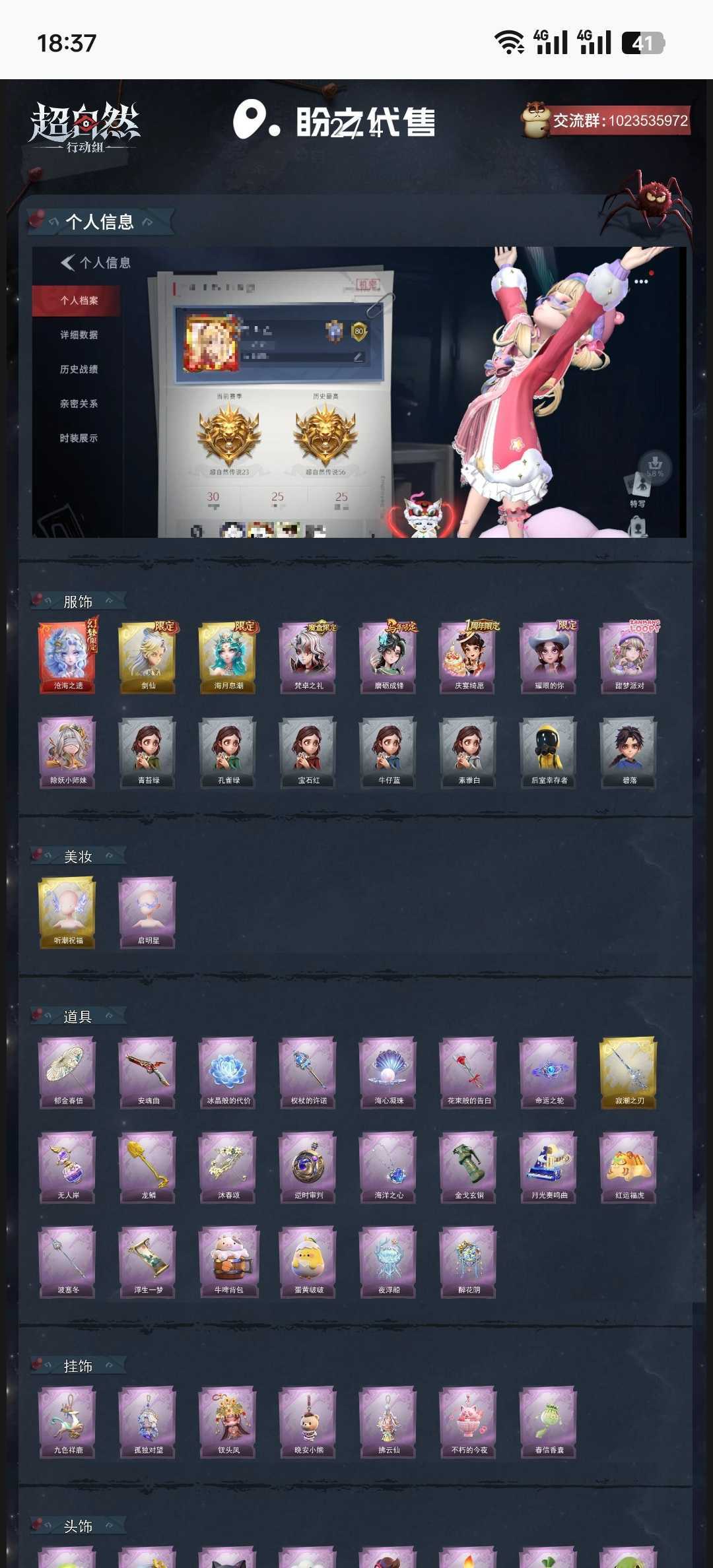 装备描述:【赛季魔盒】稀世豪华魔盒 【幻梦皮肤】薇薇安-沧海之遗 【耀世皮肤】逍遥-剑仙、薇薇安-海月息潮 【典藏皮肤】爱德华-梵卓之礼、零-磨砺成锋、阿念-庆宴绮愿、爱丽丝-耀眼的你、爱丽丝-甜梦派对、莉莉-除妖小师妹 【白色皮肤】小黄-青苔绿、小黄-孔雀绿、小黄-宝石红、小黄-牛仔蓝、小黄-素雅白、小黄-后室幸存者、逍遥-碧落 【道具皮肤】伞-郁金春信、短管猎枪-安魂曲、除额仪-冰晶般的代价、电击枪-权杖的许诺、葫芦-海心凝珠、专业手电-花束般的告白、传送按钮-命运之轮、桃木剑-寂潮之刃、黄牛能量饮料-无人岸、铲子-龙鳞、伞-沐春颂、传送按钮-逆时审判、摸金符-海洋之心、闪光弹-金戈玄铜、音响-月光奏鸣曲、腰包-红运福虎、长枪-波塞冬、传送按钮-浮生一梦、背饰-牛啤背包、背饰-蛋黄啵啵、背饰-夜浮船、背饰-醉花阴 【美妆】听潮祝福、启明星 【头饰】青团糯糯、芝麻糊汤圆、煤球喵头套、饺饺者、马上有钱、蒜了八、鱼头怪头套、烈焰红唇头套、面具马头套、哈士奇头套、萨卡班甲鱼头套、嘻嘻头套、滑稽头套、呆滞头套、卑微头套、像素朋克墨镜、后室幸存者头套 【挂饰】九色祥鹿、孤独对望、钗头凤、晚安小