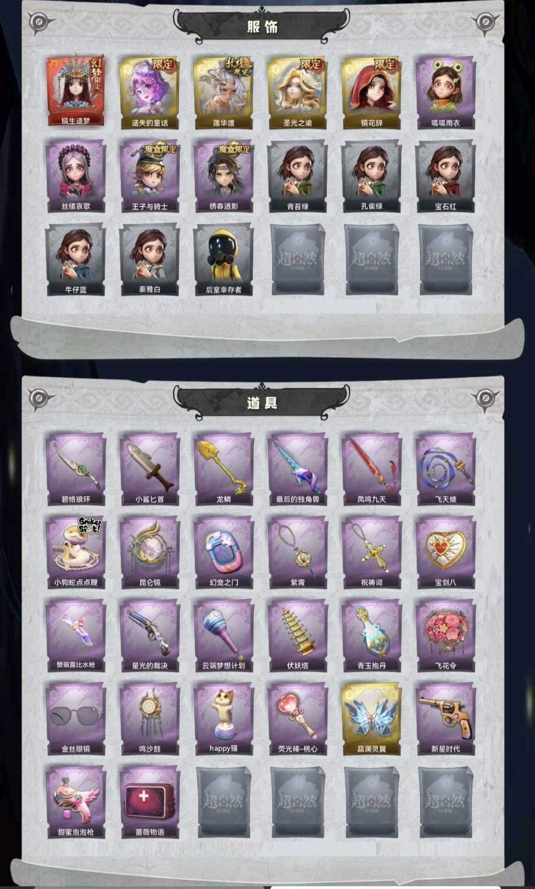 装备描述:红皮1;金皮4;紫皮4;道具皮26;皮肤:巫铃儿-镜生遗梦,小黄-遗失的童话,逍遥-莲华渡,薇薇安-圣光之谕,巫铃儿-镜花辞,小黄-呱呱雨衣,爱丽丝-丝缕哀歌,阿念-王子与骑士,逍遥-绣春逍影;道具:刺刀-碧络琅环,刺刀-小鲨匕首,铲子-龙鳞,桃木剑-最后的独角兽,桃木剑-凤鸣九天,长鞭-飞天绫,长鞭-小狗蛇点点鞭,传送按钮-昆仑镜,传送按钮-幻宠之门,摸金符-紫霄,摸金符-祝祷词,腰包-宝剑八,短管猎枪-赞萌露比水枪,短管猎枪-星光的裁决,专业手电-云端梦想计划,葫芦-伏妖塔,黄牛能量饮料-青玉抱丹,额外的背包-飞花令,夜视仪-金丝眼镜,音响-鸣沙鼓,音响-happy猫,荧光棒-桃心-荧光棒-桃心,喷气背包-晶澜灵翼,转轮手枪-新星时代,电击枪-甜蜜泡泡枪,急救包-蔷薇物语;饰品:头饰-樱桃奶油布丁,头饰-惊魂南瓜头套,头饰-小财神豚豚头套,头饰-精致露比头套,头饰-小狗蛇点点头套,头饰-火爆了头套,头饰-大葱明头套,头饰-炙热烧烤,头饰-鱼头怪头套,头饰-烈焰红唇头套,头饰-面具马头套,头饰-哈士奇头套,头饰-萨卡班甲鱼头套,头饰-嘻嘻头套,头饰-滑稽头套,头饰-呆滞头套,头饰-卑