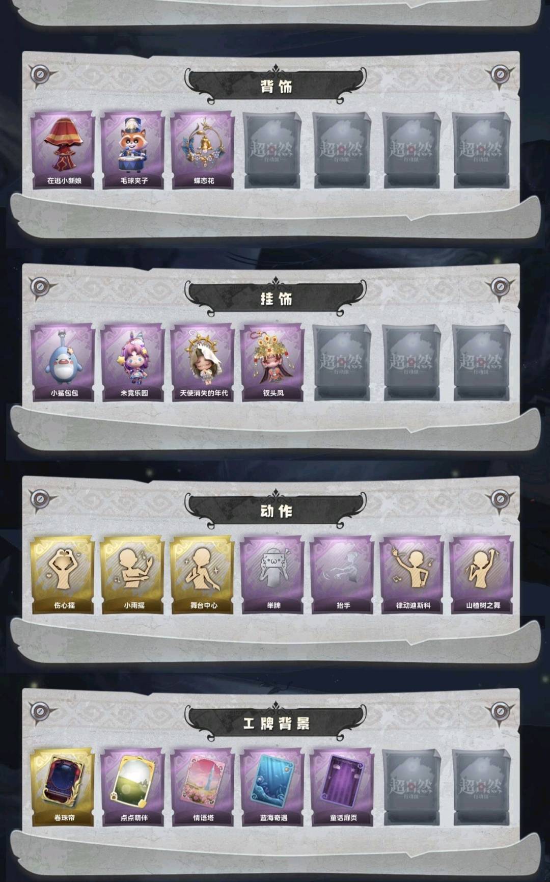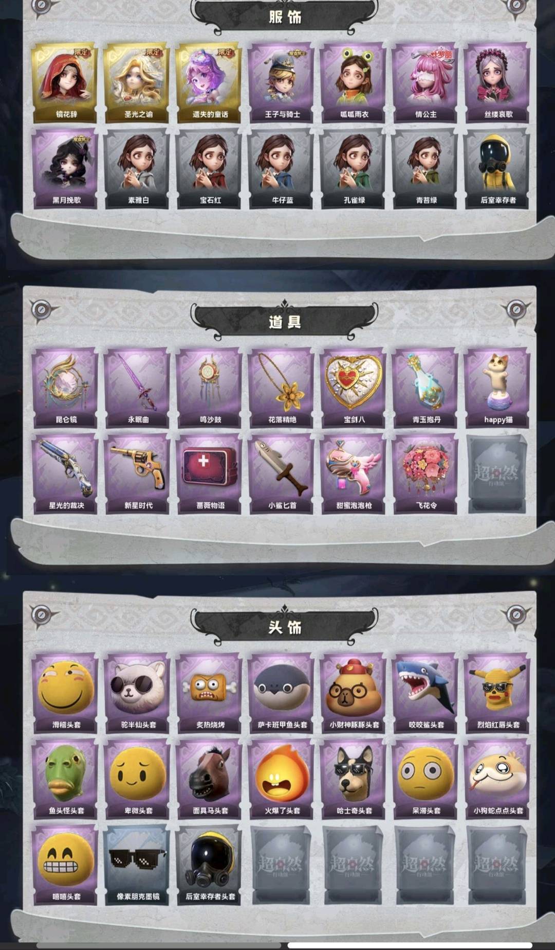 装备描述:金皮3;紫皮5;道具皮13;皮肤:巫铃儿-镜花辞,薇薇安-圣光之谕,小黄-遗失的童话,阿念-王子与骑士,小黄-呱呱雨衣,莉莉-情公主,爱丽丝-丝缕哀歌,薇薇安-黑月挽歌;道具:传送按钮-昆仑镜,桃木剑-永眠曲,音响-鸣沙鼓,摸金符-花落精绝,腰包-宝剑八,黄牛能量饮料-青玉抱丹,音响-happy猫,短管猎枪-星光的裁决,转轮手枪-新星时代,急救包-蔷薇物语,刺刀-小鲨匕首,电击枪-甜蜜泡泡枪,额外的背包-飞花令;饰品:头饰-滑稽头套,头饰-驼半仙头套,头饰-炙热烧烤,头饰-萨卡班甲鱼头套,头饰-小财神豚豚头套,头饰-咬咬鲨头套,头饰-烈焰红唇头套,头饰-鱼头怪头套,头饰-卑微头套,头饰-面具马头套,头饰-火爆了头套,头饰-哈士奇头套,头饰-呆滞头套,头饰-小狗蛇点点头套,头饰-嘻嘻头套,头饰-像素朋克墨镜,头饰-后室幸存者头套,挂饰-小鲨包包,挂饰-未竟乐园,挂饰-天使消失的年代,挂饰-钗头凤,背饰-在逃小新娘,背饰-毛球夹子,背饰-蝶恋花;动作:动作-伤心摇,动作-小雨摇,动作-舞台中心,动作-举牌,动作-抬手,动作-律动迪斯科,动作-山楂树之舞;工牌背景:工牌背景-卷珠帘,工牌背景