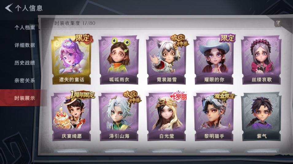 装备描述:皮肤:小黄-遗失的童话,逍遥-泽引山海,小黄-呱呱雨衣,薇薇安-白光莹,小黄-霓裳踏雪,艾伦-黎明猎手,阿念-庆宴绮愿,爱丽丝-耀眼的你,爱丽丝-丝缕哀歌;道具:刺刀-铂刺与红萼,转轮手枪-新星时代,急救包-蔷薇物语,长鞭-小狗蛇点点鞭,铲子-圣心之泪,长鞭-缚誓之锁,专业手电-云端梦想计划,桃木剑-最后的独角兽,刺刀-小鲨匕首,音响-鸣沙鼓,伞-郁金春信,闪光弹-金戈玄铜;饰品:头饰-卑微头套,头饰-萨卡班甲鱼头套,头饰-太空鲨头套,头饰-呆滞头套,头饰-煤球喵头套,头饰-雪墩墩头套,头饰-大葱明头套,头饰-芝麻糊汤圆,头饰-滑稽头套,头饰-面具马头套,头饰-炙热烧烤,头饰-惊魂南瓜头套,头饰-樱桃奶油布丁,头饰-嘻嘻头套,,头饰-哈士奇头套,头饰-火爆了头套,头饰-青团糯糯,头饰-烈焰红唇头套,头饰-鱼头怪头套,头饰-马上有钱,头饰-鳄霸天头套,头饰-蒜了八,头饰-像素朋克墨镜,头饰-后室幸存者头套,挂饰-九色祥鹿,挂饰-天使消失的年代,挂饰-孤独对望,挂饰-尘封旧事,挂饰-未竟乐园,挂饰-春信香囊,背饰-牛啤背包,背饰-云梦之星;动作:动作-新年摇,动作-luvab