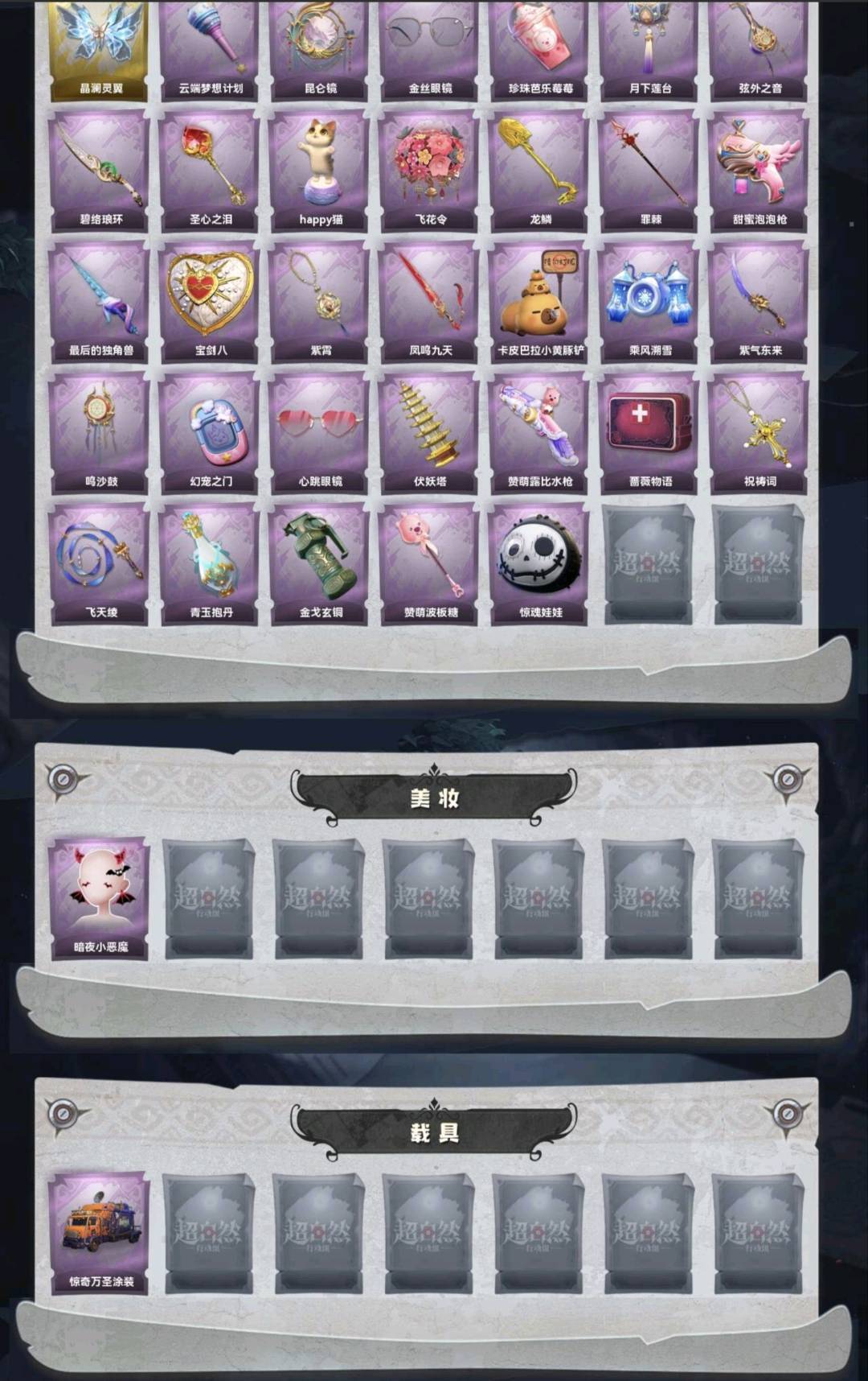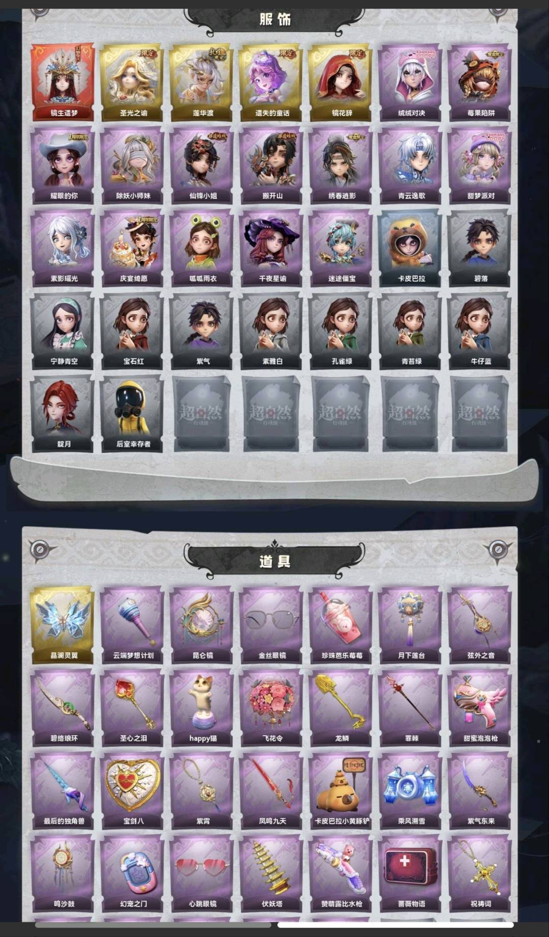 装备描述:红皮1;金皮4;紫皮14;道具皮33;皮肤:巫铃儿-镜生遗梦,薇薇安-圣光之谕,逍遥-莲华渡,小黄-遗失的童话,巫铃儿-镜花辞,艾伦-绒绒对决,莉莉-莓果陷阱,爱丽丝-耀眼的你,莉莉-除妖小师妹,薇薇安-仙锋小姐,零-搬开山,逍遥-绣春逍影,零-青云逸歌,爱丽丝-甜梦派对,巫铃儿-素影瑶光,阿念-庆宴绮愿,小黄-呱呱雨衣,兰-千夜星谕,阿念-迷途僵宝;道具:喷气背包-晶澜灵翼,专业手电-云端梦想计划,传送按钮-昆仑镜,夜视仪-金丝眼镜,黄牛能量饮料-珍珠芭乐莓莓,腰包-月下莲台,除颤仪-弦外之音,刺刀-碧络琅环,铲子-圣心之泪,音响-happy猫,额外的背包-飞花令,铲子-龙鳞,长枪-罪棘,电击枪-甜蜜泡泡枪,桃木剑-最后的独角兽,腰包-宝剑八,摸金符-紫霄,桃木剑-凤鸣九天,铲子-卡皮巴拉小黄豚铲,喷气背包-乘风溯雪,刺刀-紫气东来,音响-鸣沙鼓,传送按钮-幻宠之门,夜视仪-心跳眼镜,葫芦-伏妖塔,短管猎枪-赞萌露比水枪,急救包-蔷薇物语,摸金符-祝祷词,长鞭-飞天绫,黄牛能量饮料-青玉抱丹,闪光弹-金戈玄铜,铲子-赞萌波板糖,腰包-惊魂娃娃;美妆:美妆-暗夜小恶魔;饰品:头饰-卑微