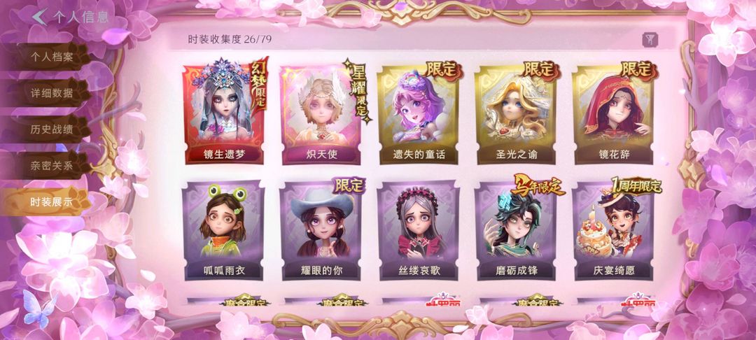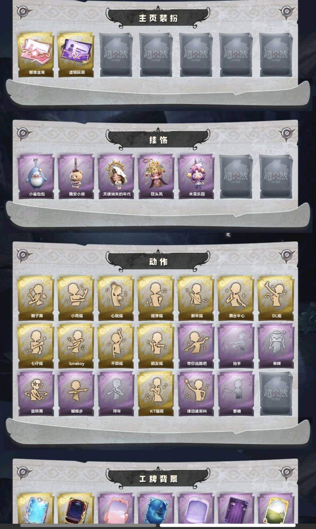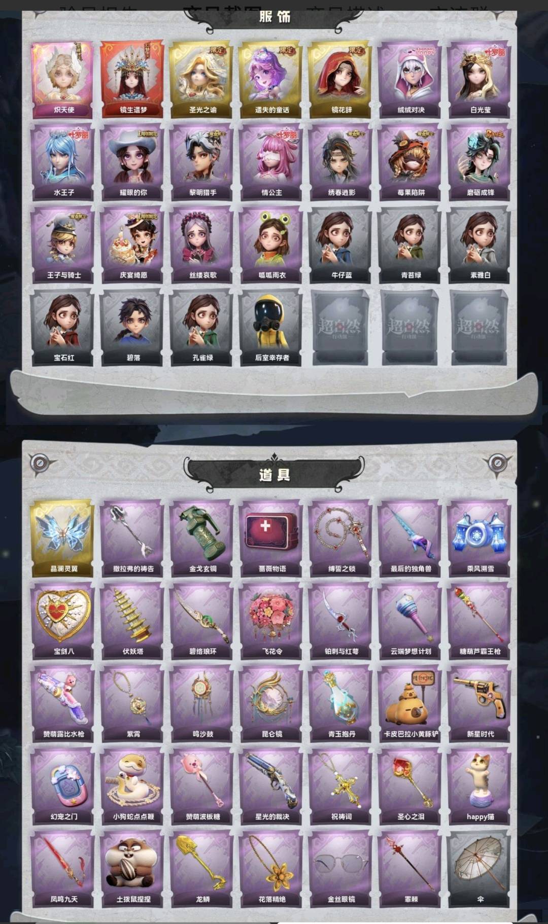 装备描述:红皮1;粉皮1;金皮3;紫皮13;道具皮35;皮肤:小黄-炽天使,巫铃儿-镜生遗梦,薇薇安-圣光之谕,小黄-遗失的童话,巫铃儿-镜花辞,艾伦-绒绒对决,薇薇安-白光莹,艾伦-水王子,爱丽丝-耀眼的你,艾伦-黎明猎手,莉莉-情公主,逍遥-绣春逍影,莉莉-莓果陷阱,零-磨砺成锋,阿念-王子与骑士,阿念-庆宴绮愿,爱丽丝-丝缕哀歌,小黄-呱呱雨衣;道具:喷气背包-晶澜灵翼,铲子-撒拉弗的祷告,闪光弹-金戈玄铜,急救包-蔷薇物语,长鞭-缚誓之锁,桃木剑-最后的独角兽,喷气背包-乘风溯雪,腰包-宝剑八,葫芦-伏妖塔,刺刀-碧络琅环,额外的背包-飞花令,刺刀-铂刺与红萼,专业手电-云端梦想计划,长枪-糖葫芦霸王枪,短管猎枪-赞萌露比水枪,摸金符-紫霄,音响-鸣沙鼓,传送按钮-昆仑镜,黄牛能量饮料-青玉抱丹,铲子-卡皮巴拉小黄豚铲,转轮手枪-新星时代,传送按钮-幻宠之门,长鞭-小狗蛇点点鞭,铲子-赞萌波板糖,短管猎枪-星光的裁决,摸金符-祝祷词,铲子-圣心之泪,音响-happy猫,桃木剑-凤鸣九天,急救包-土拨鼠捏捏,铲子-龙鳞,摸金符-花落精绝,夜视仪-金丝眼镜,长枪-罪棘,伞-伞;美妆:美妆-天