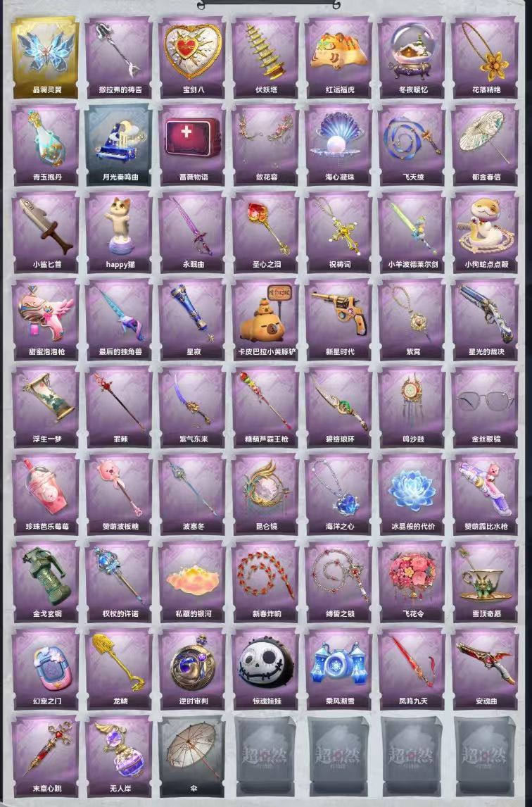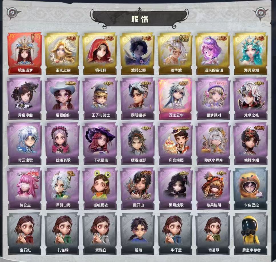 满氪翅膀♈1幻梦6金20紫♈镜生遗梦♈莲华渡♈镜花辞♈海月息潮♈圣光之谕♈渡鸦公爵♈万迭云华♈除妖小