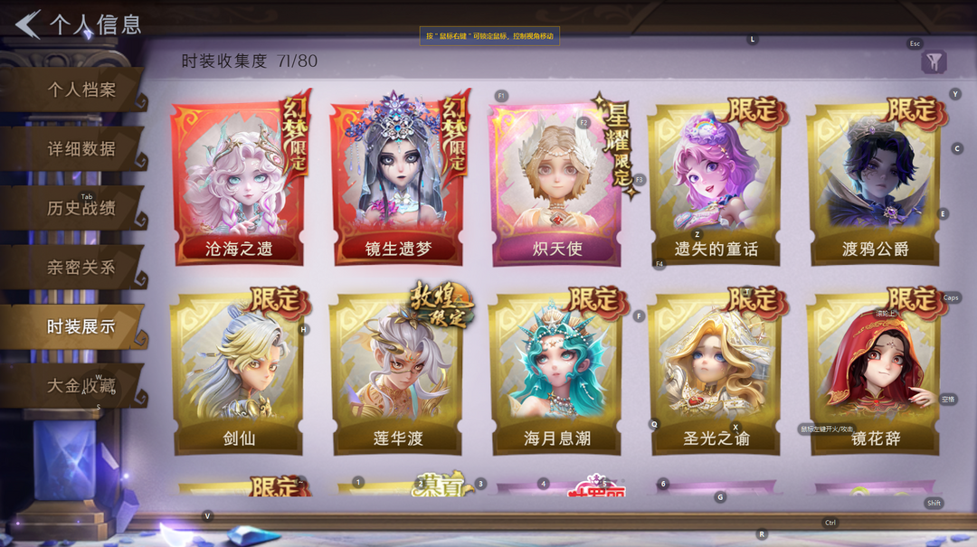 71皮肤有铲币满氪条/2红1星耀9金33紫/炽天使沧海之遗镜生遗梦/剑仙莲华渡渡鸦公爵/瑶台梦春之声
