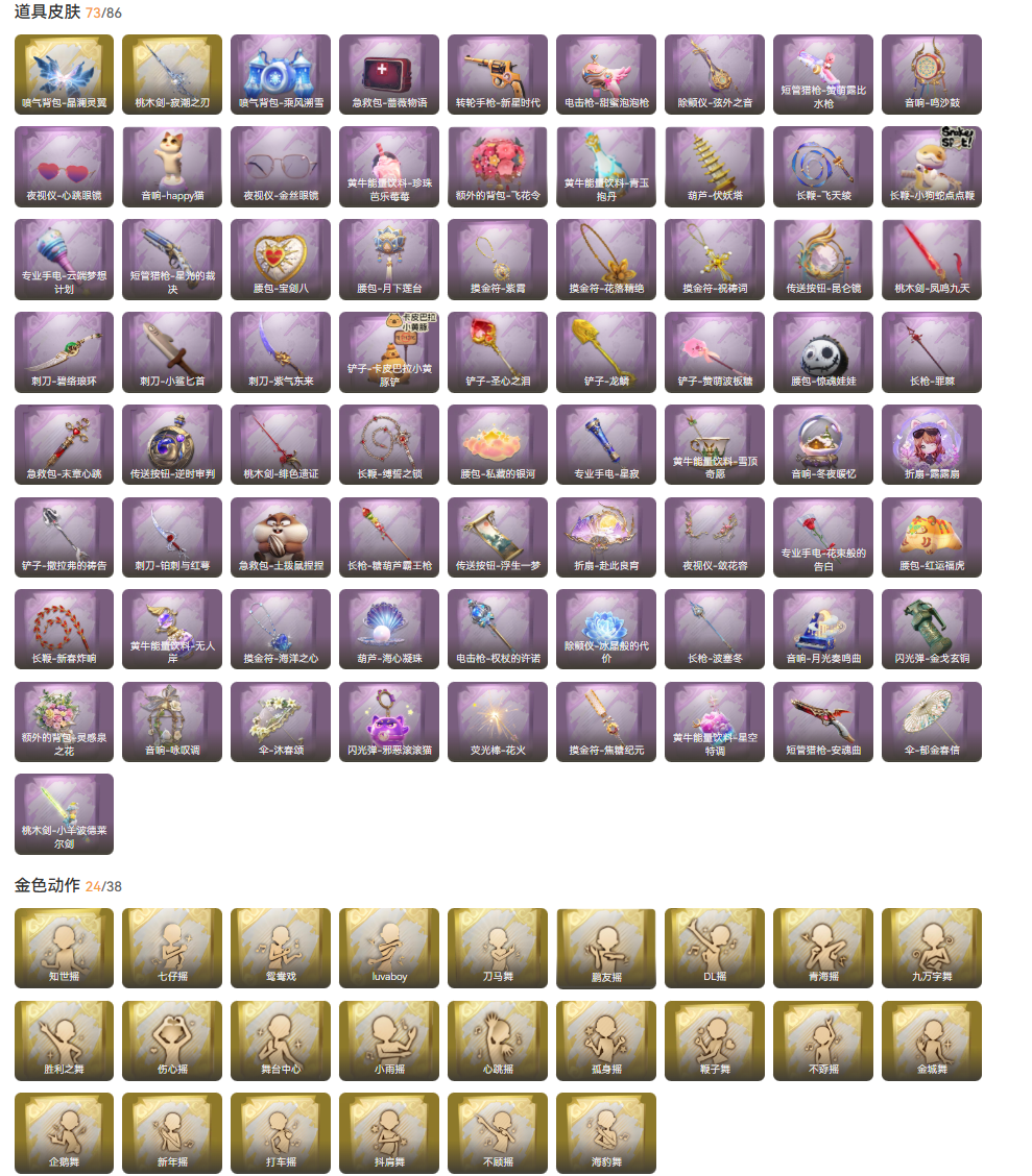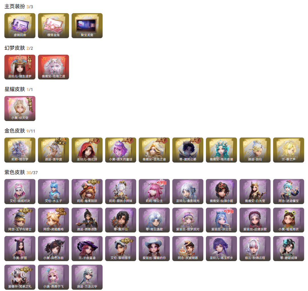 装备描述:71皮肤满氪条/2红1星耀9金33紫/78道具皮肤73饰品 星耀皮肤 小黄-炽天使 幻梦皮肤 巫铃儿-镜生遗梦、薇薇安-沧海之遗 金色皮肤 薇薇安-圣光之谕、小黄-遗失的童话、巫铃儿-镜花辞、逍遥-莲华渡、零-渡鸦公爵、莉莉-瑶台梦、逍遥-剑仙、薇薇安-海月息潮、兰-春之声 紫色皮肤 小黄-异色序曲、小黄-罗丽、小黄-呱呱雨衣、爱丽丝-丝缕哀歌、爱丽丝-冰公主、零-青云逸歌、阿念-灵昭鹿鸣、阿念-王子与骑士、阿念-迷途僵宝、逍遥-绣春逍影、薇薇安-白光莹、巫铃儿-素影瑶光、莉莉-情公主、莉莉-除妖小师妹、莉莉-莓果陷阱、艾伦-水王子、艾伦-绒绒对决、爱丽丝-甜梦派对、薇薇安-仙锋小姐、零-搬开山、兰-千夜星谕、艾伦-黎明猎手、阿念-庆宴绮愿、爱丽丝-耀眼的你、零-磨砺成锋、临云-织锦云程、巫铃儿-琢玉怀乡、爱德华-梵卓之礼、逍遥-万迭云华、小满-燕燕于飞
