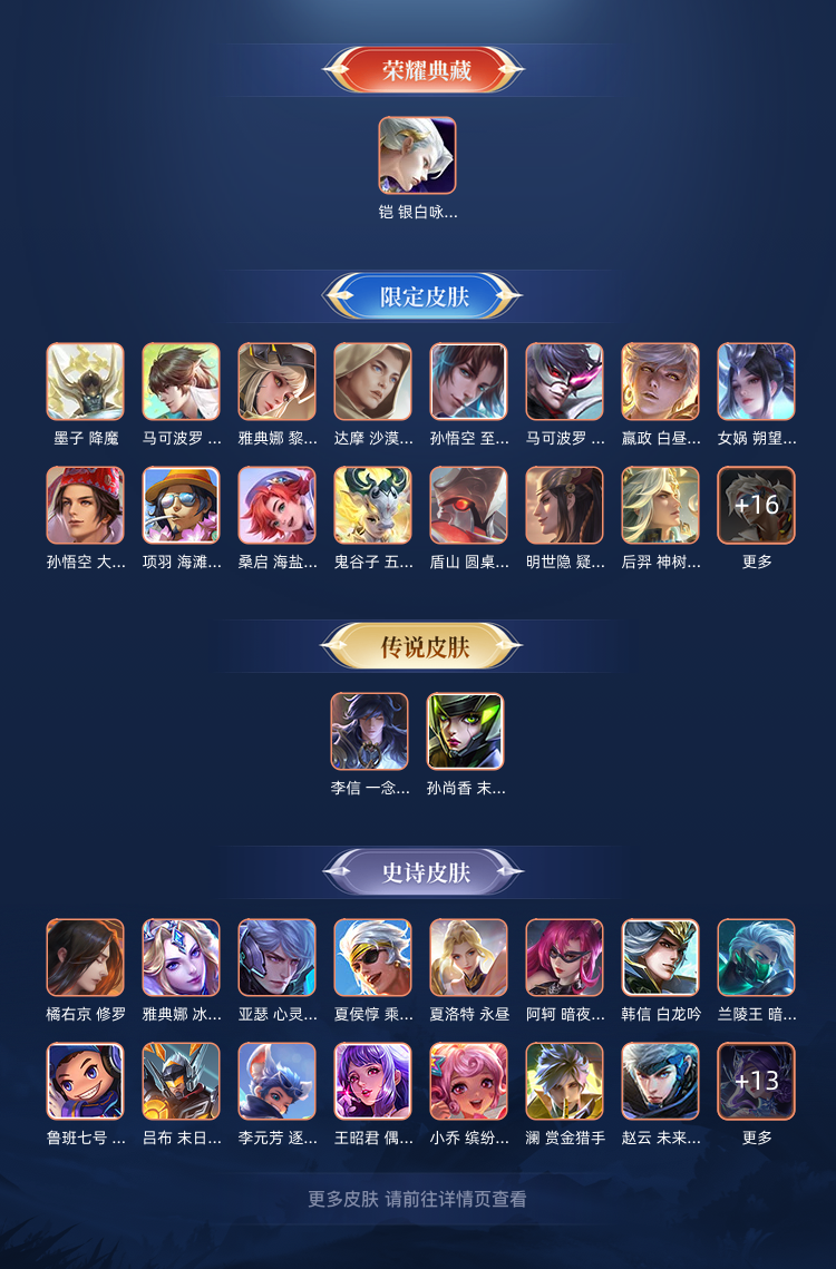 装备描述:英雄:孙悟空(孙悟空 至尊宝,孙悟空 大圣娶亲,孙悟空 西部大镖客);老夫子(老夫子 潮流仙人,老夫子 醍醐杖,老夫子 功夫老勺);夏洛特(夏洛特 永昼);吕布(吕布 末日机甲,吕布 圣诞狂欢,吕布 猎兽之王);达摩(达摩 沙漠行僧,达摩 大发明家,达摩 拳王);诸葛亮(诸葛亮 黄金分割率,诸葛亮 星航指挥官);夏侯惇(夏侯惇 朔风刀,夏侯惇 乘风破浪);李白(李白 千年之狐,李白 范海辛);鲁班七号(鲁班七号 福禄兄弟,鲁班七号 电玩小子,鲁班七号 黑桃队长,鲁班七号 狮舞东方);花木兰(花木兰 水晶猎龙者,花木兰 剑舞者,花木兰 默契交锋,花木兰 兔女郎);澜(澜 赏金猎手,澜 孤猎);韩信(韩信 街头霸王,韩信 白龙吟,韩信 教廷特使);橘右京(橘右京 修罗);孙尚香(孙尚香 蔷薇恋人,孙尚香 沉稳之力,孙尚香 末日机甲,孙尚香 水果甜心);黄忠(黄忠 芝加哥教父);狂铁(狂铁 特工战影,狂铁 御狮);百里守约(百里守约 绝影神枪);铠(铠 曙光守护者,铠 银白咏叹调,铠 龙域领主);墨子(墨子 降魔,墨子 金属风暴);亚连(亚连 破局者);貂蝉(貂蝉 圣诞恋歌,貂蝉 异域舞娘)