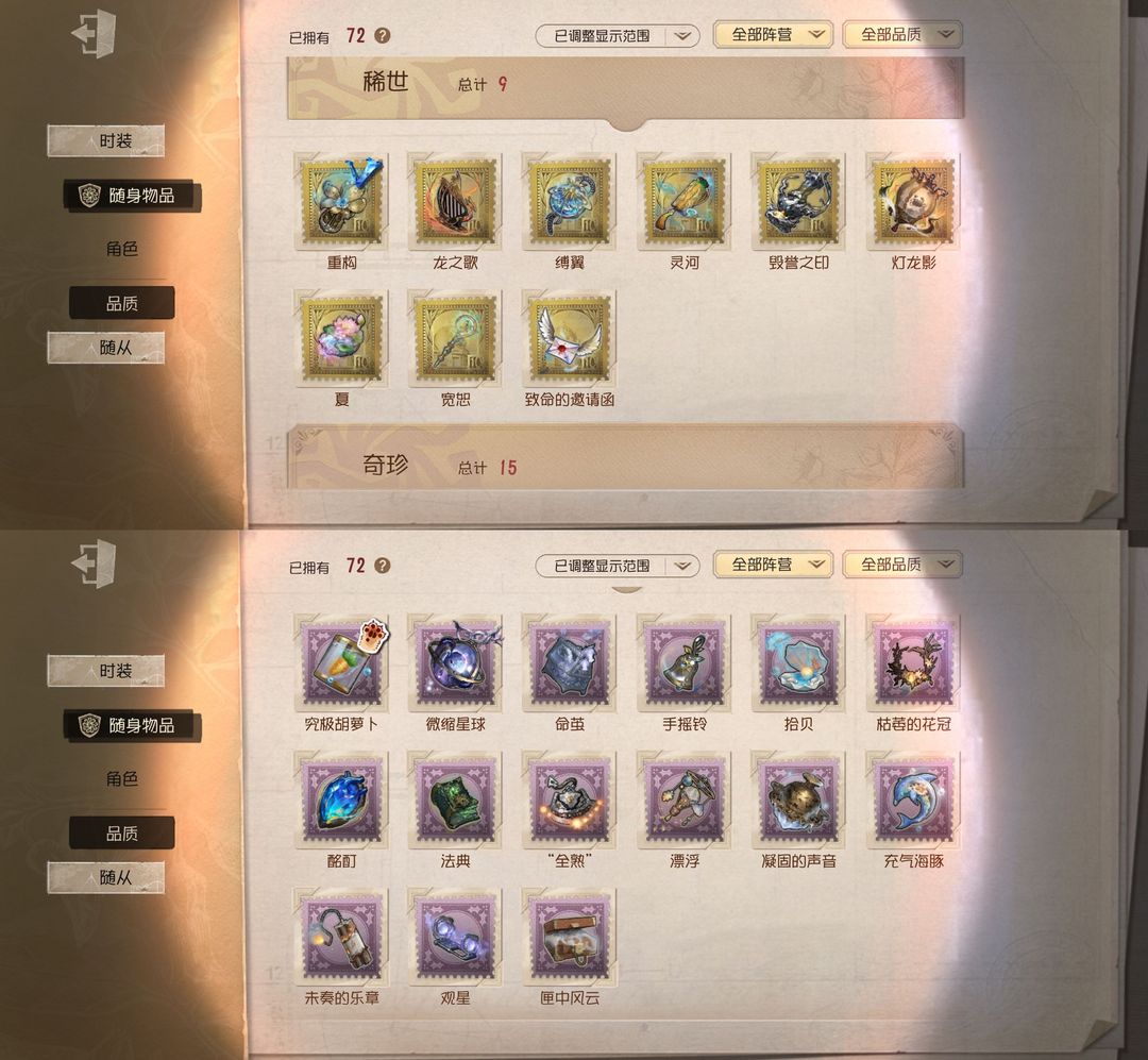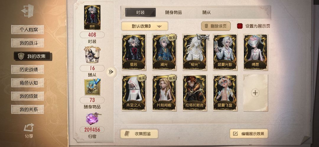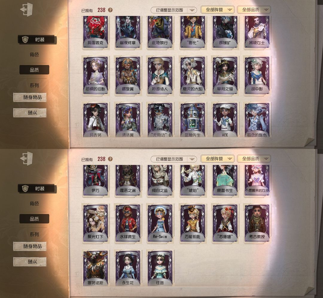 装备描述:✨【账号亮点速览】✨ • 稀世时装(金皮):病患-溯光(限定)、摄影师-“恒光”、勘探员-拉塔托斯克、病患-星辰 • 奇珍时装(紫皮):昆虫学者-缚愿、勘探员-盛夏飞盘、病患-盛夏光影、古董商-陶梦嫣(纸嫁衣联动)、记者-伊布(IB联动)、兔爷、苍白冠冕、匣中焰星、巡于归途、深蓝暗面、不羁欢歌、掌中篆记、雷斯垂德探长、华生医生、宿醉、藏品/裁缝夫人/善忘的海马体等超多热门紫皮,P5联动、时光代理人等联动齐全 • 稀世随身物品(金挂):共9个金挂,特效拉满,搭配本命皮肤手感极佳 • 随从:蛋仔派对联动、熊猫、狼人等多款限定随从