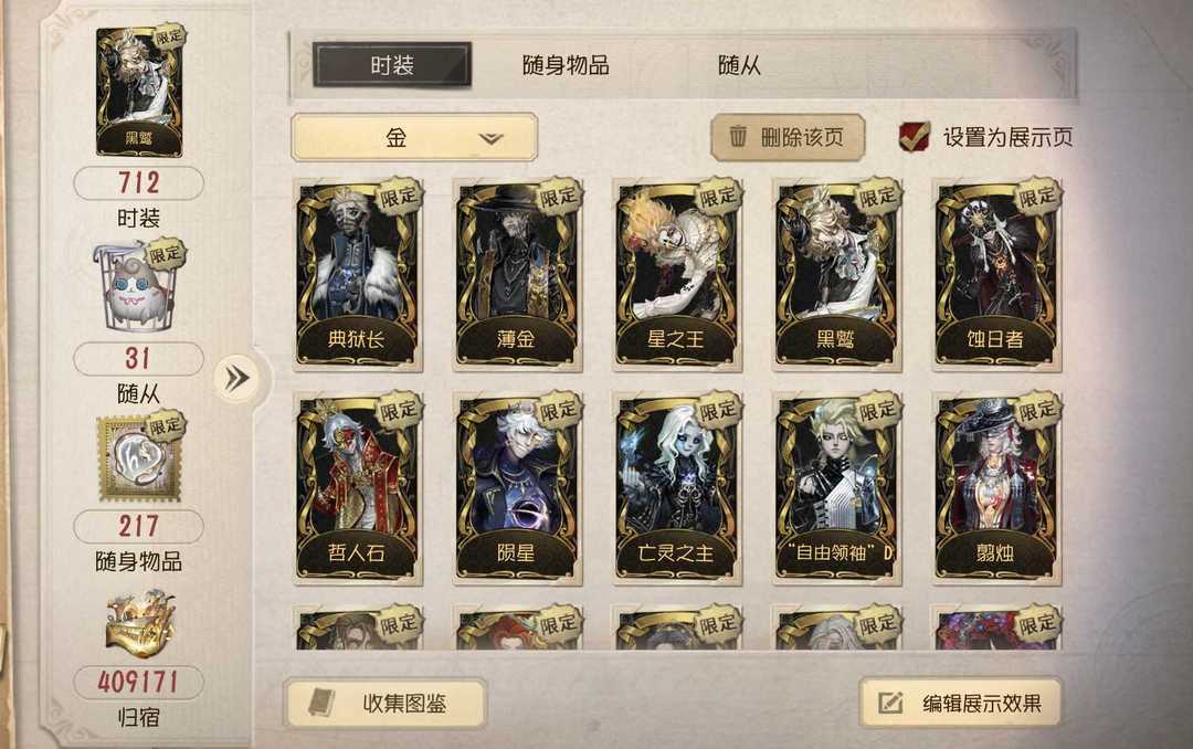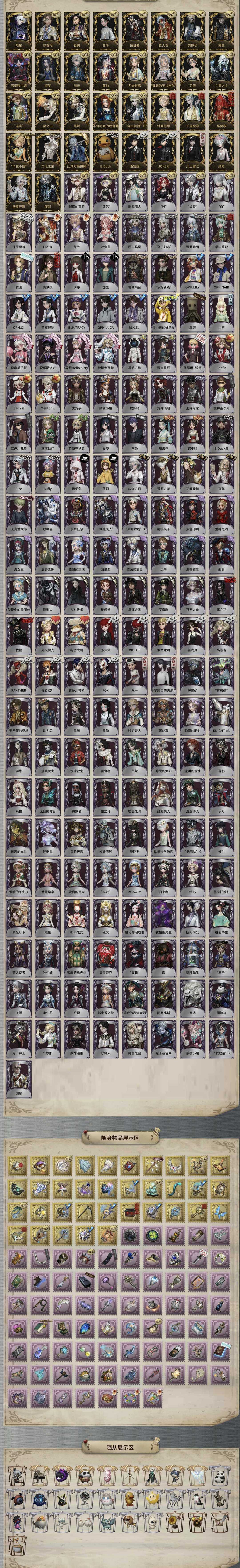 装备描述:男屠真理号,守夜全收集,白泽,典狱长,亡灵之主,温室,岩鸽 ,富江,名誉首席,星之王,电竞皮等