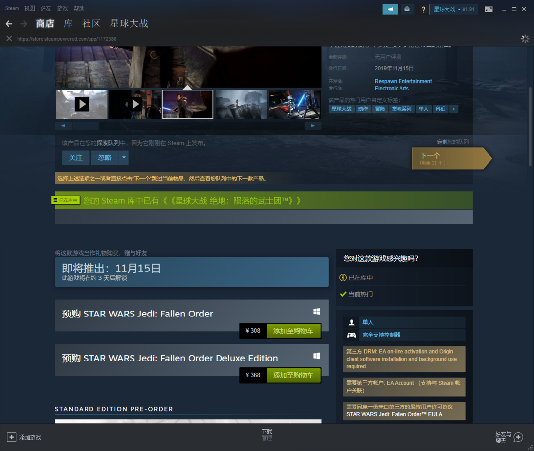 装备描述:《星球大战绝地陨落的武士团™》预购-终极版!全DLC!已绑定橘子!直接玩!